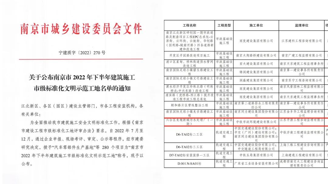 近日,南京市城鄉(xiāng)建設(shè)委員會發(fā)布了《關(guān)于公示南京市2022年下半年建筑施工市級標準化文明示范工地名單的通知》,公司承建的南京市六合區(qū)龍袍新城污水廠(一期)榮獲南京市2022年下半年建筑施工市級標準化文明示范工地。...