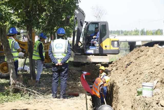 在主管網鋪設同時,部分支線管網也開始鋪設。依據設計要求,施工方按照沿路、沿河鋪設的方案,盡可能減少開挖面積。
