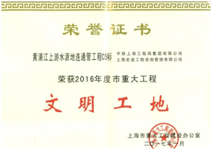 近日,從上海市重大工程建設(shè)辦公室傳來佳訊,由公司承建的上海黃浦江上游水源地連通管工程C5標(biāo)項(xiàng)目榮獲上海市“2016年度重大工程文明工地”稱號(hào),為公司再添榮譽(yù)。