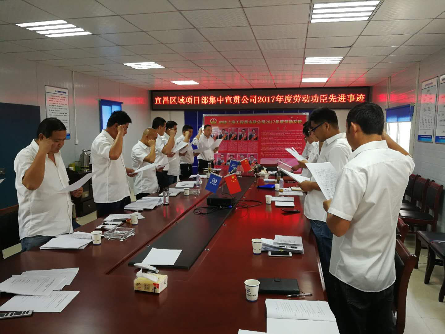 ☆4月19日,宜昌區(qū)域項目部組織干部職工宣貫公司2017年度“勞動功臣”先進事跡。宣貫會上,首先由區(qū)域項目黨總支書記向大家介紹了公司2017年度“勞動功臣”的先進模范事跡,督促各項目全體干部職工向“勞動功臣”學習,弘揚敢于爭先、勇創(chuàng)一流的工作精神,營造人人學當先進、事事爭做楷模的良好氛圍。隨后,由桔鄉(xiāng)路項目經理領誓,帶領大家莊嚴宣讀公司誓言。最后,全體與會人員依次在簽名板上簽名,表達自己向公司“勞動功臣”努力學習并付諸實踐的決心。(馮理欽)