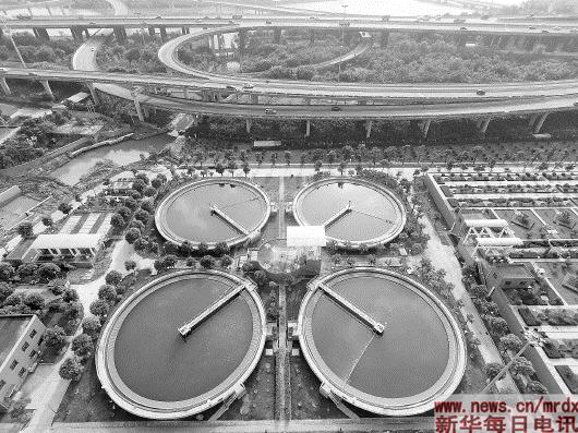 福州洋里污水廠三期二次沉淀池和頂層綠化的生物反應(yīng)池(7月2日無人機(jī)拍攝)。